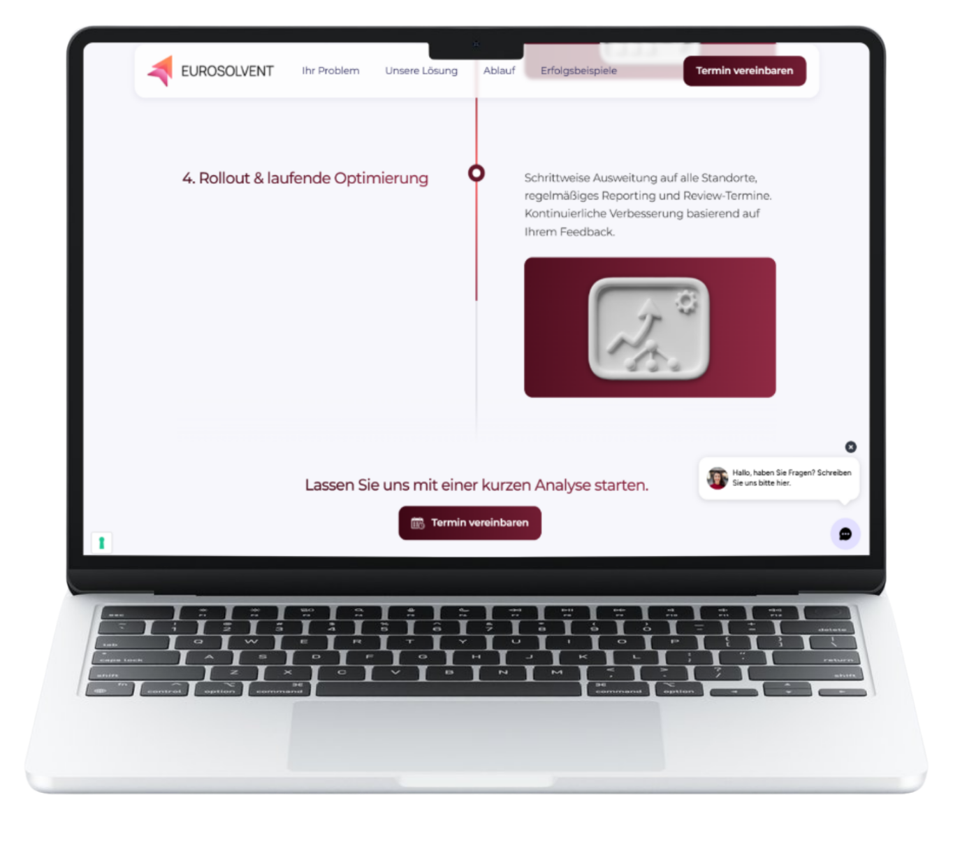 Der 4-Schritte-Ablauf erklärt sauber, wie die Zusammenarbeit startet und warum das Ganze kontrollierbar bleibt (Analyse → Konzept → Pilotphase → Rollout). Das wirkt seriös, reduziert Angst vor Aufwand und macht die Lösung greifbar.